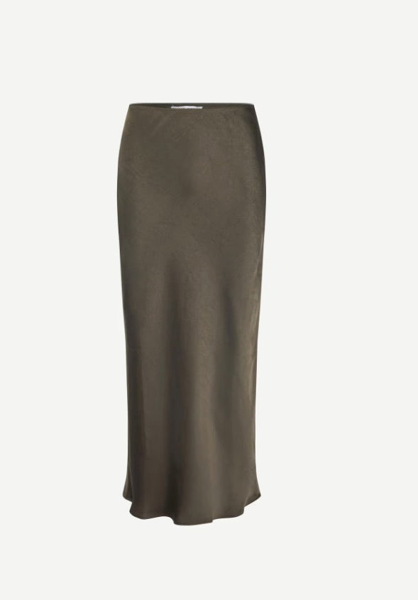 Satin maxi skirt with a slim fit. Elastic waistband. Main material made from 100% recycled polyester.