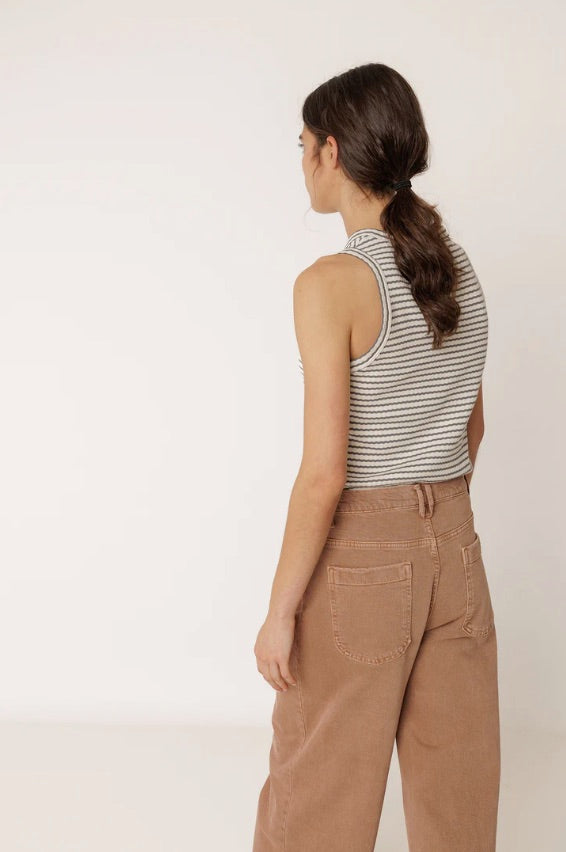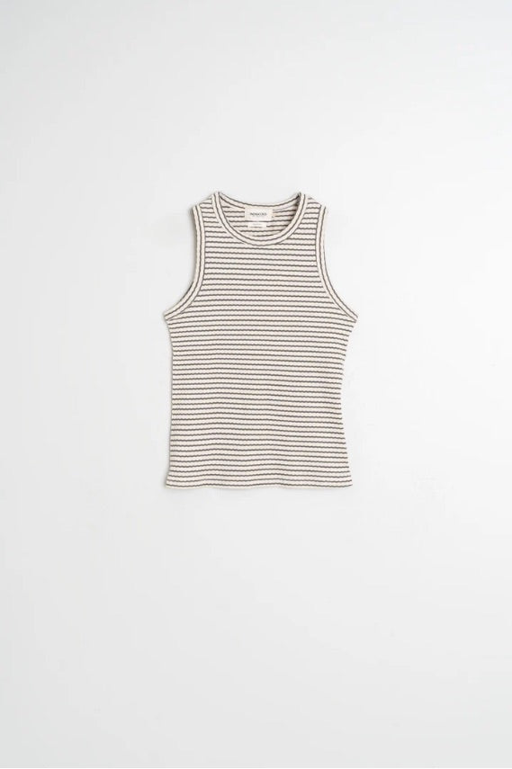 Esta camiseta sin mangas y de corte slim, presenta un diseño con cuello halter y una textura acanalada. Perfecto para combinar con cualquiera de nuestros tejanos.