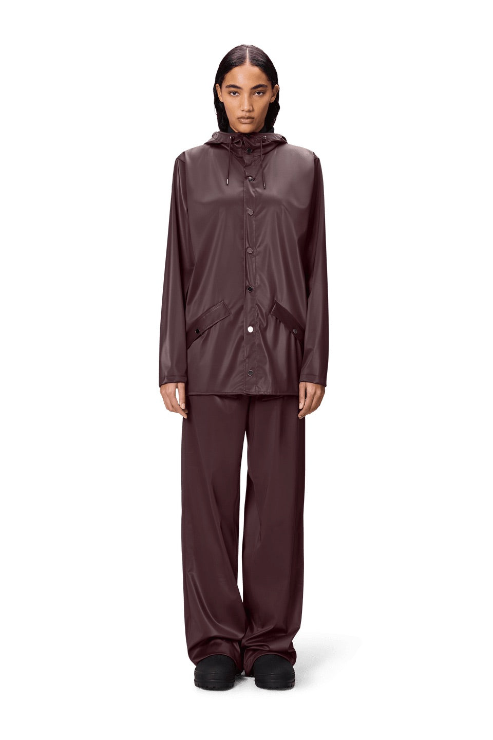Esta chaqueta impermeable, confeccionada en el PU característico de Rains, presenta costuras soldadas por ultrasonidos. Se completa con un acabado ligero, un tacto suave y un elegante drapeado.