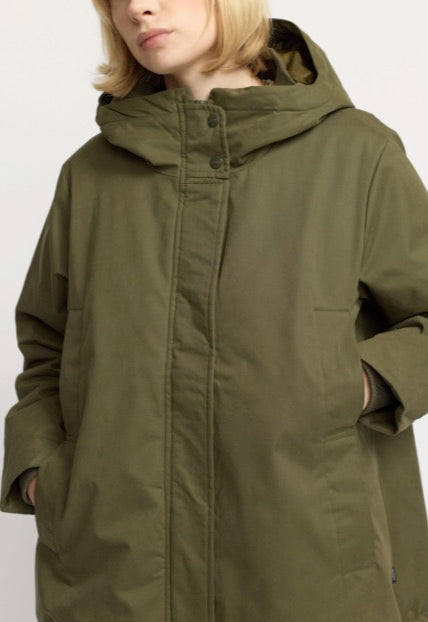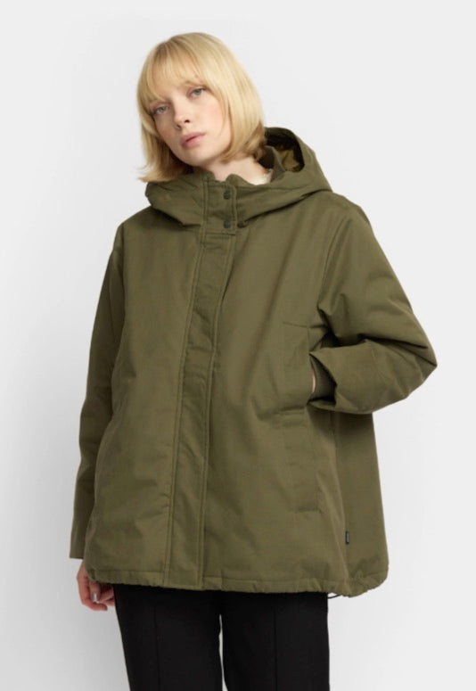 Short, hooded jacket made of a recycled polyester fabric with a soft, peached surface and with tone in tone trimmings. The jacket is made with characteristic double welt-pockets and lined with warm fleece fabric for extra comfort. The jacket is designed with a cozy inner rib-collar and hidden rib cuff, and it has an adjustable bottom hemline to keep out the wind and cold weather. The water-repellent Teflon EcoElite coating is environmentally friendly, free of harmful fluorocarbon. The jacket is padded with 80 gms Recycled Thinsulate™ insulation, made of 78% recycled fibres. It traps more air in less space and keeps you surprisingly warm.