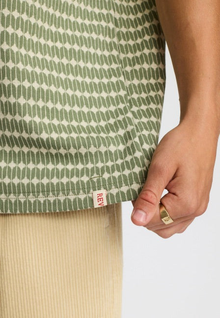 A short-sleeved loose-fitted Polo shirt crafted from a soft and stretchy organic cotton jersey, making it comfortable for the summer days. The fabric is jacquard-knitted with a small graphical pattern, and the shirt is detailed with a rib collar and 4-hole tone-in-tone buttons. The hem and sleeve are made with a twin needle stitch for extra comfort. The finishing of the shirt adds softness and ensures stability and durability to the style