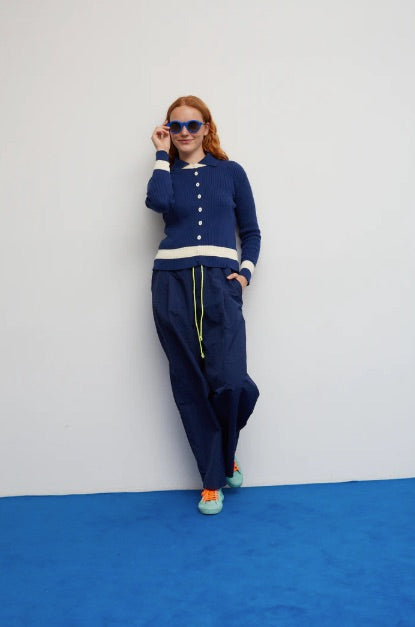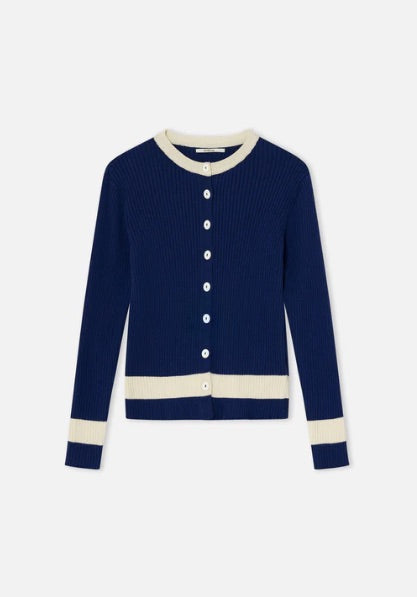 Una chaqueta de punto que combina lo clásico con un toque desenfadado. Su tejido canalé en azul marino es suave y favorecedor, mientras que los detalles en crema —en el cuello, los puños y el bajo— aportan luz y un contraste muy especial. Los botones frontales completan el look con un aire vintage encantador.